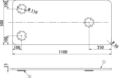 - H 15 mm, B 1100 mm, T 500 mm.