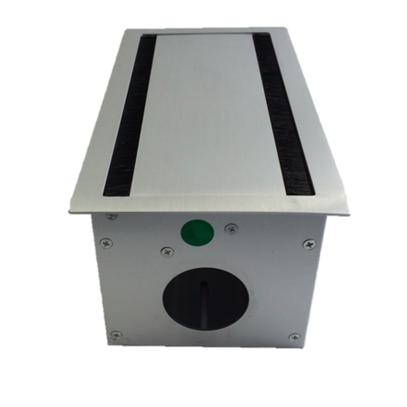 - Metall-Einbaubox mit Wechselscharnier beidseitig zu öffnen, mit schwarzer Bürstendichtung und Softdown-Schliessung und integrierter Box für Steckdosenleisten und Kabelüberlängen.
