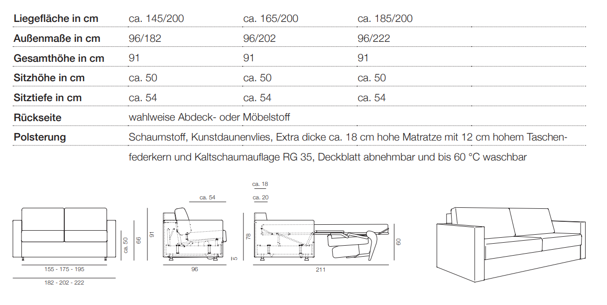 Mit nur zwei Handgriffen verwandeln Sie den Zweisitzer in ein vollwertiges Doppelbett mit loser Taschenfederkern-Matratze. Onda ist in drei verschiedenen Liegebreiten erhältlich, sogar bis zu einer Liegefläche von 185/200 cm! Das Deckblatt ist abnehmbar und bis 60 °C waschbar.