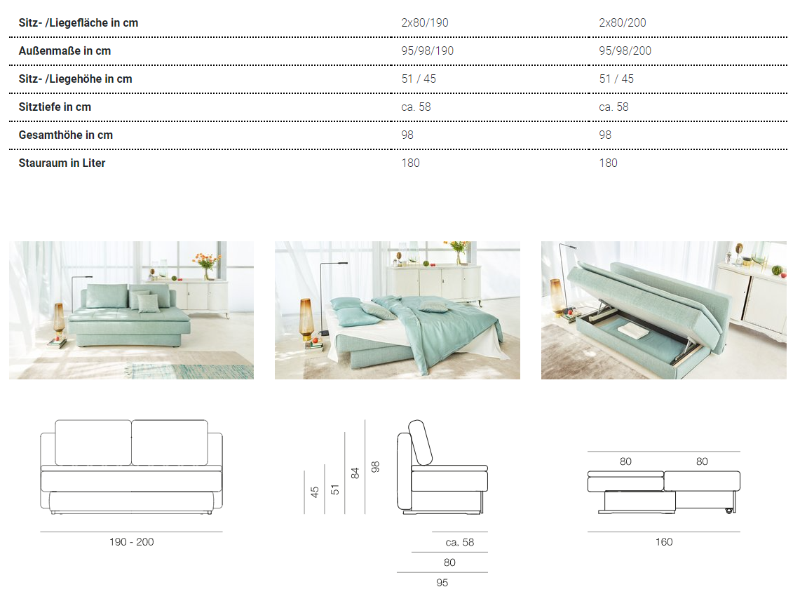 - Sitz-/Liegefläche 2x80x190 oder 2x80x200 cm