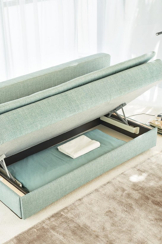 Durch die Umklappfunktion ist Perla kinderleicht in ein Doppelbett zu verwandeln. Praktisch ist auch der Stauraum, der in jeder Position nutzbar ist. Eine Besonderheit des Schlafsofas ist der integrierte Topper, der das Übernachten noch einfacher und bequemer macht.